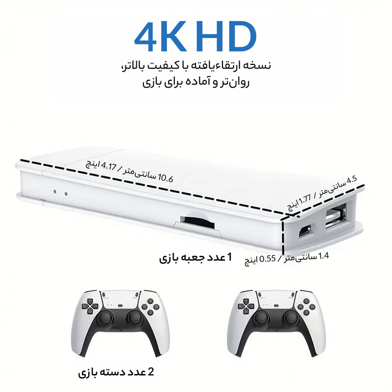 امکانات و قابلیت‌ها : دارای چندین بازی نوستالژیک از 23 کنسول جداب کیفیت تصویر 4K دارای دو عدد دسته بی سیم دارای شک و جوی استیک کنسول بازی دانگل بلوتوثی دسته دو عدد کابل رابط HDMI کابل یو اس بی برای تغذیه دستگاه