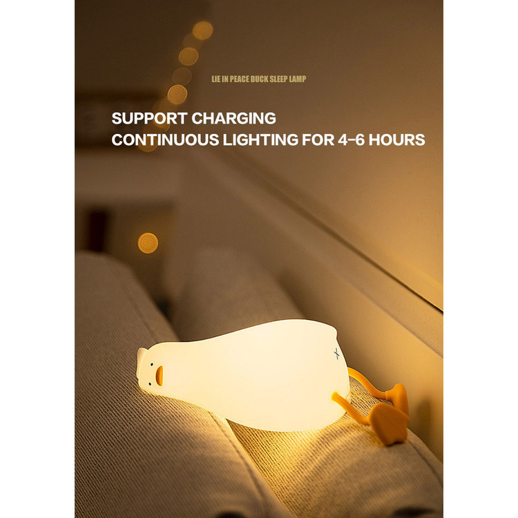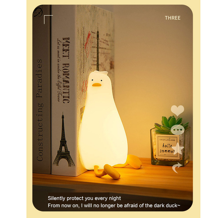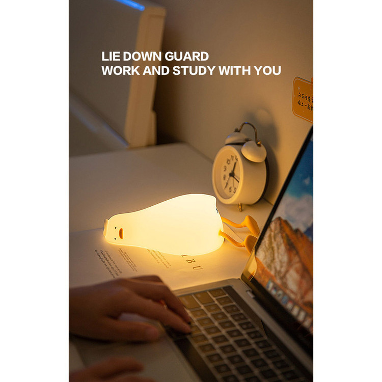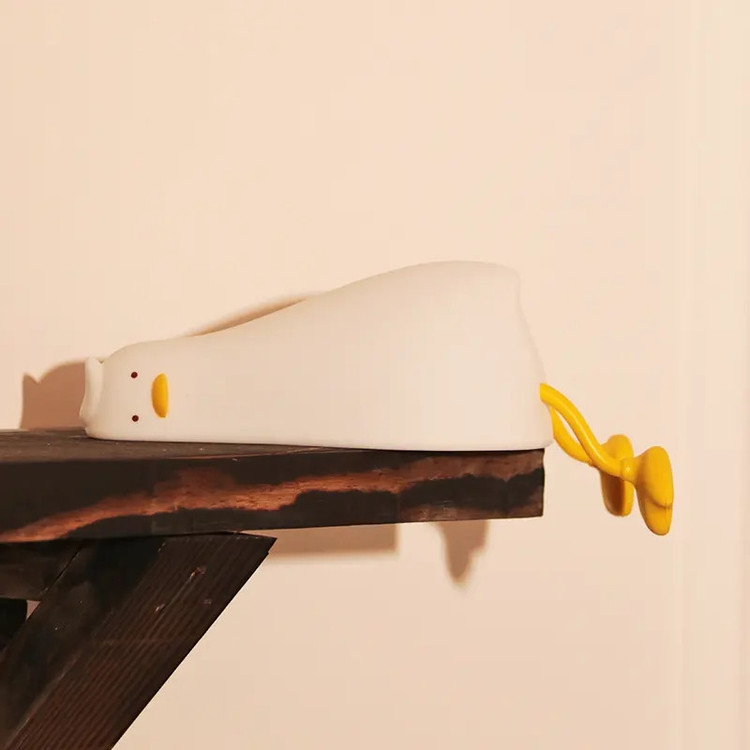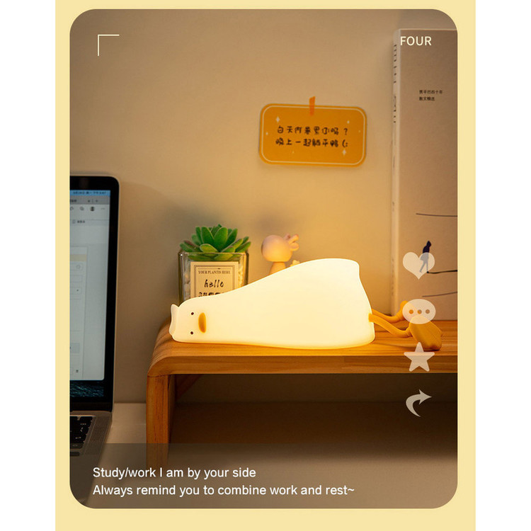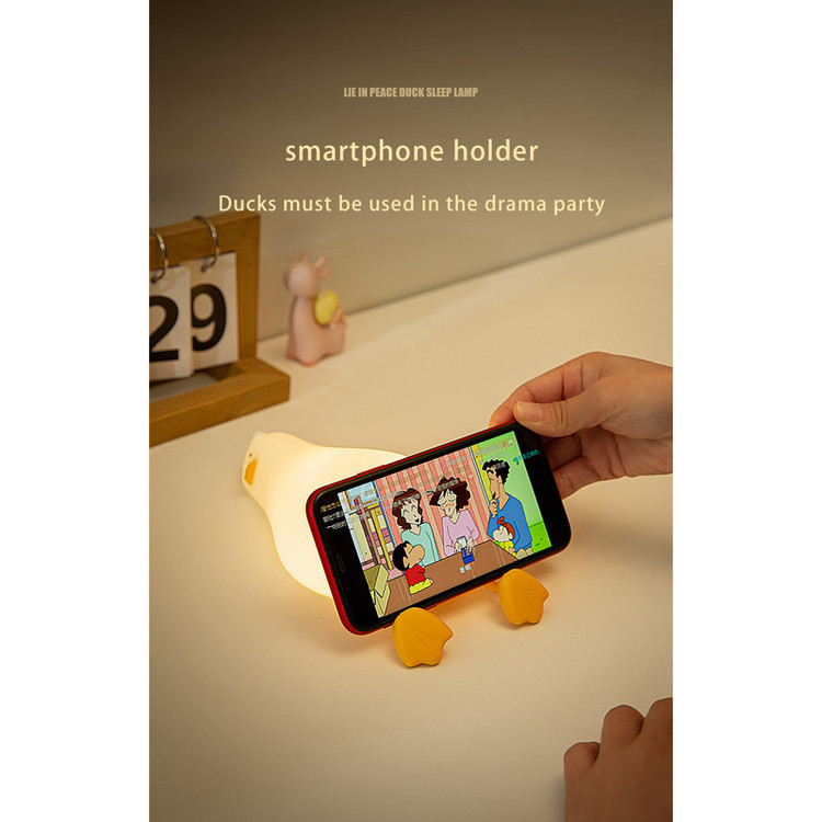 چراغ مطالعه و رومیزی اردک مدل خسته یک دکوراتیو جذاب و مینیمال است که می تواند به اتاق خواب، محل کار یا هر فضای دیگری جلوه ای زیبا و بامزه ببخشد. این چراغ خواب دارای دیمر است بدین معنی که شدت روشنایی آن در 3 درجه مختلف قابل تنظیم است که با یک ضربه کوچک به پشت اردک میتوان میزان روشنایی را تغییر داد. در زیر شکم این اردک خسته یک کلید سه حالته قرار دارد که می توان آن را در حالت خاموش، روشن و تایمر 30 دقیقه ای قرار داد. اگر کلید را روی حالت 30 دقیقه قرار دهید بعد از نیم ساعت به صورت خودکار چراغ خواب خاموش می شود. چراغ خواب اردک مدل خسته دارای یک باتری 1200 میلی آمپر ساعتی داخلیست که حدود 2 ساعت شارژ کامل آن زمان می برد و می تواند برای 4 تا 6 ساعت بسته به میزان روشنایی تنظیم شده نوردهی داشته باشد. یک ویژگی جالب این چراغ خواب امکان استفاده از آن به عنوان استند موبایل است، فقط کافیست گوشی خود را روی پاهای اردک قرار دهید تا موبایلتان را برای شما نگه دارد و به راحتی به تماشای فیلم دلخواه خود مشغول شوید. به همراه این محصول یک دفترچه راهنما و یک عدد کابل تایپ C جهت شارژ محصول ارائه می گردد.