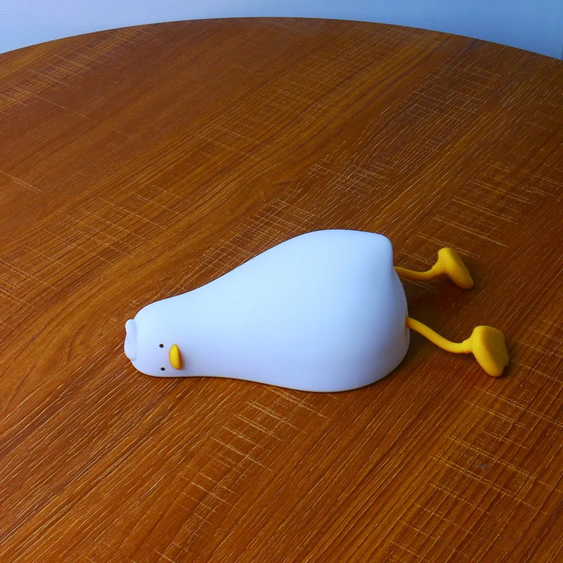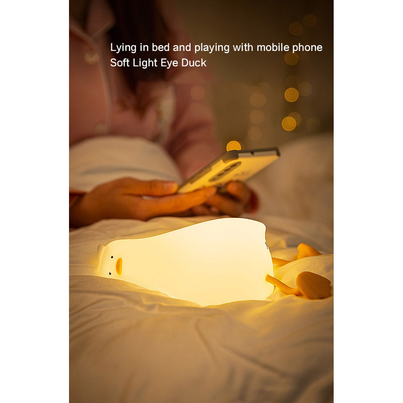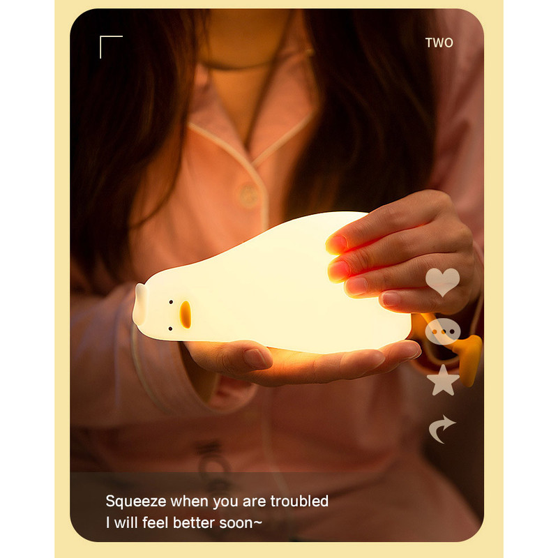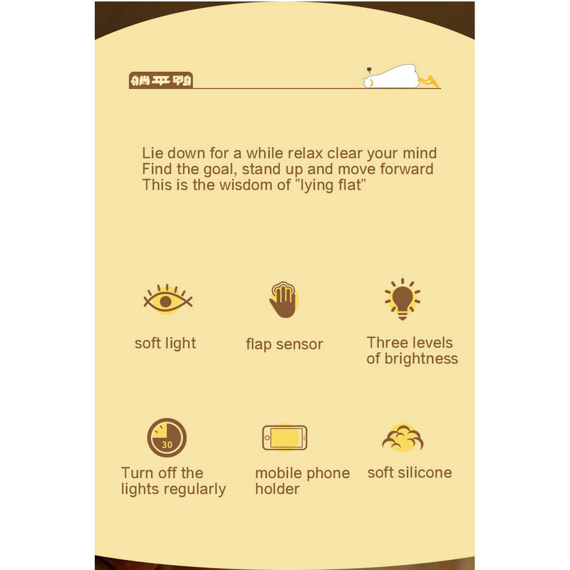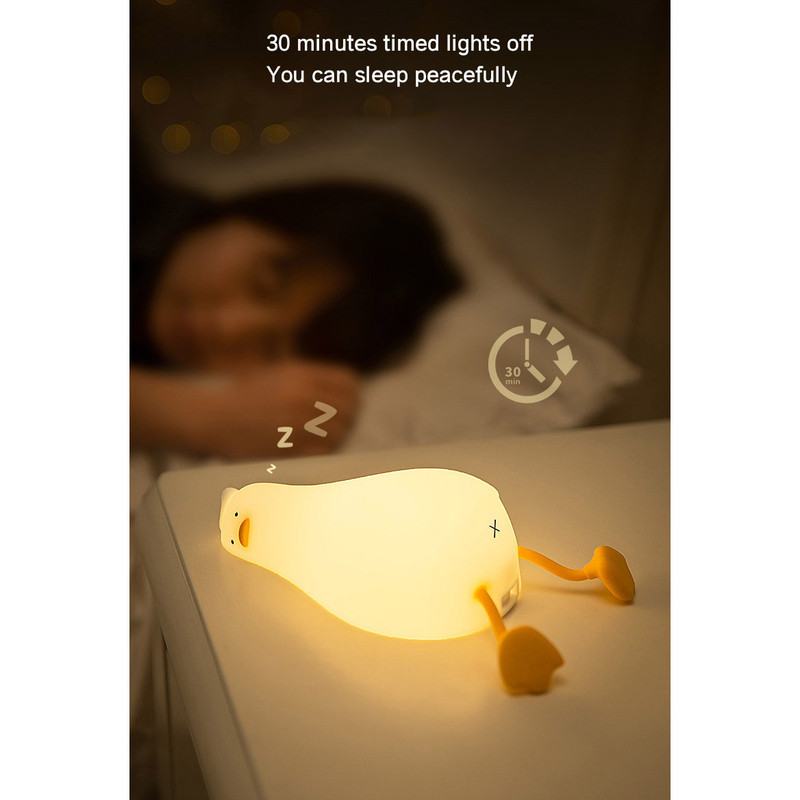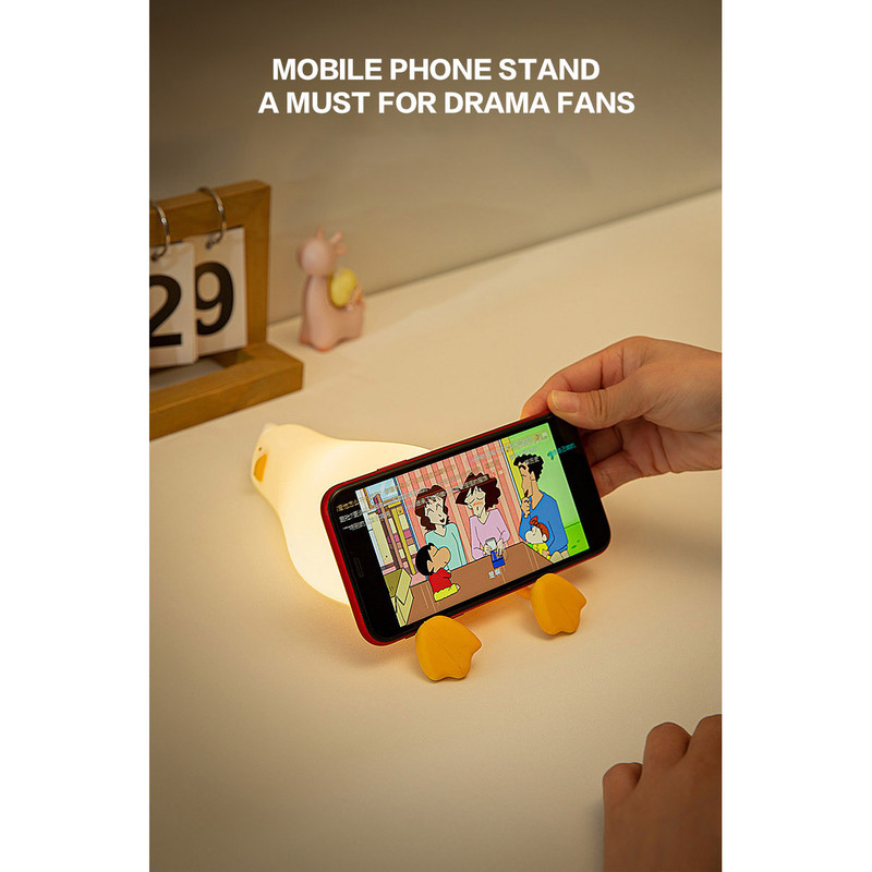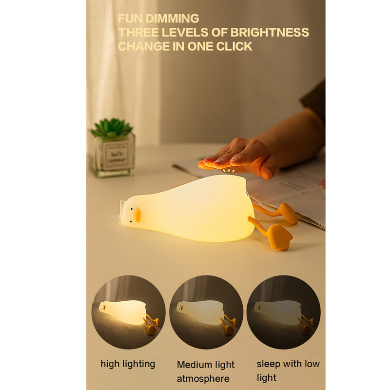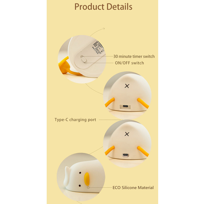 چراغ مطالعه و رومیزی اردک مدل خسته یک دکوراتیو جذاب و مینیمال است که می تواند به اتاق خواب، محل کار یا هر فضای دیگری جلوه ای زیبا و بامزه ببخشد. این چراغ خواب دارای دیمر است بدین معنی که شدت روشنایی آن در 3 درجه مختلف قابل تنظیم است که با یک ضربه کوچک به پشت اردک میتوان میزان روشنایی را تغییر داد. در زیر شکم این اردک خسته یک کلید سه حالته قرار دارد که می توان آن را در حالت خاموش، روشن و تایمر 30 دقیقه ای قرار داد. اگر کلید را روی حالت 30 دقیقه قرار دهید بعد از نیم ساعت به صورت خودکار چراغ خواب خاموش می شود. چراغ خواب اردک مدل خسته دارای یک باتری 1200 میلی آمپر ساعتی داخلیست که حدود 2 ساعت شارژ کامل آن زمان می برد و می تواند برای 4 تا 6 ساعت بسته به میزان روشنایی تنظیم شده نوردهی داشته باشد. یک ویژگی جالب این چراغ خواب امکان استفاده از آن به عنوان استند موبایل است، فقط کافیست گوشی خود را روی پاهای اردک قرار دهید تا موبایلتان را برای شما نگه دارد و به راحتی به تماشای فیلم دلخواه خود مشغول شوید. به همراه این محصول یک دفترچه راهنما و یک عدد کابل تایپ C جهت شارژ محصول ارائه می گردد.